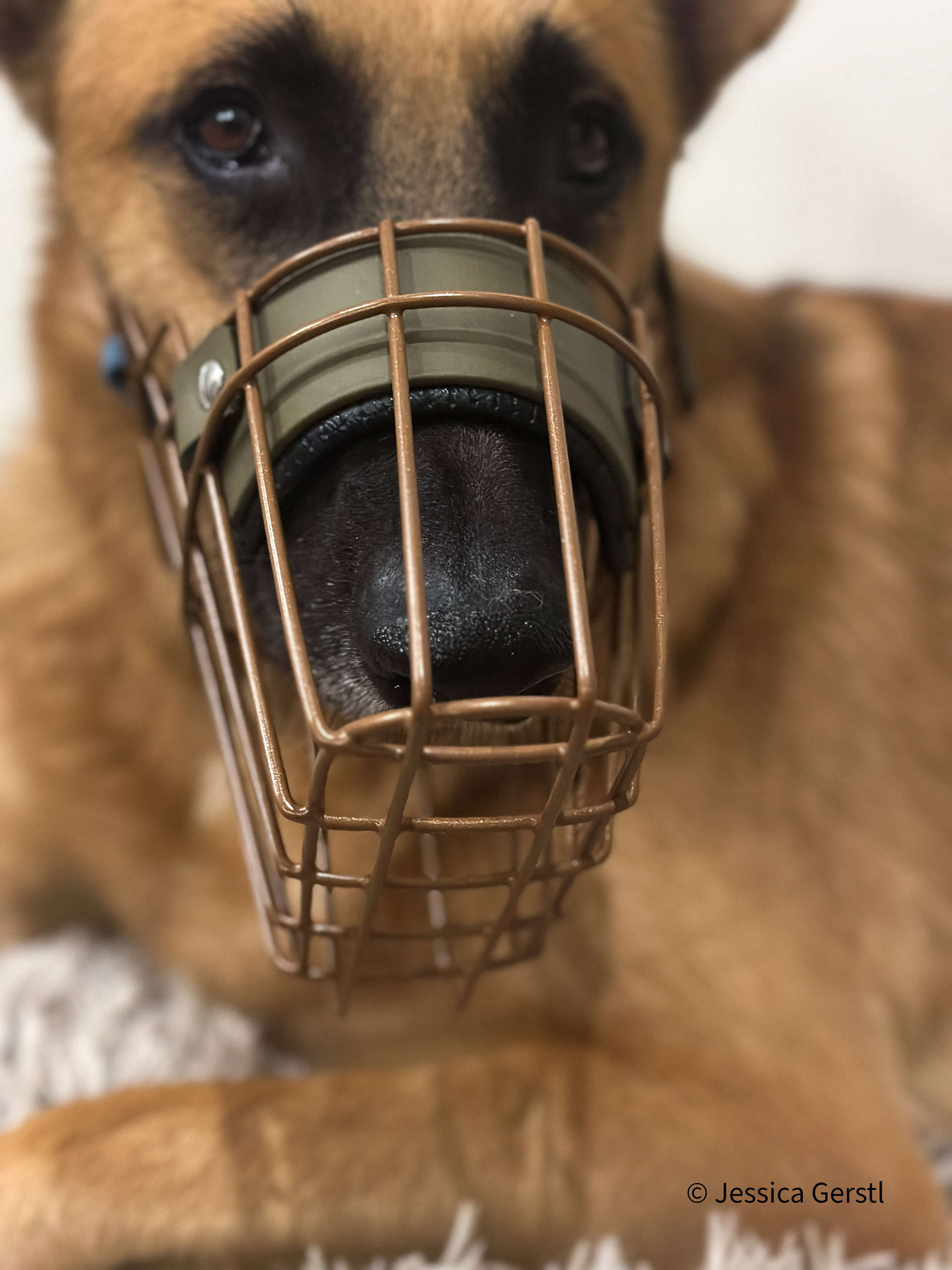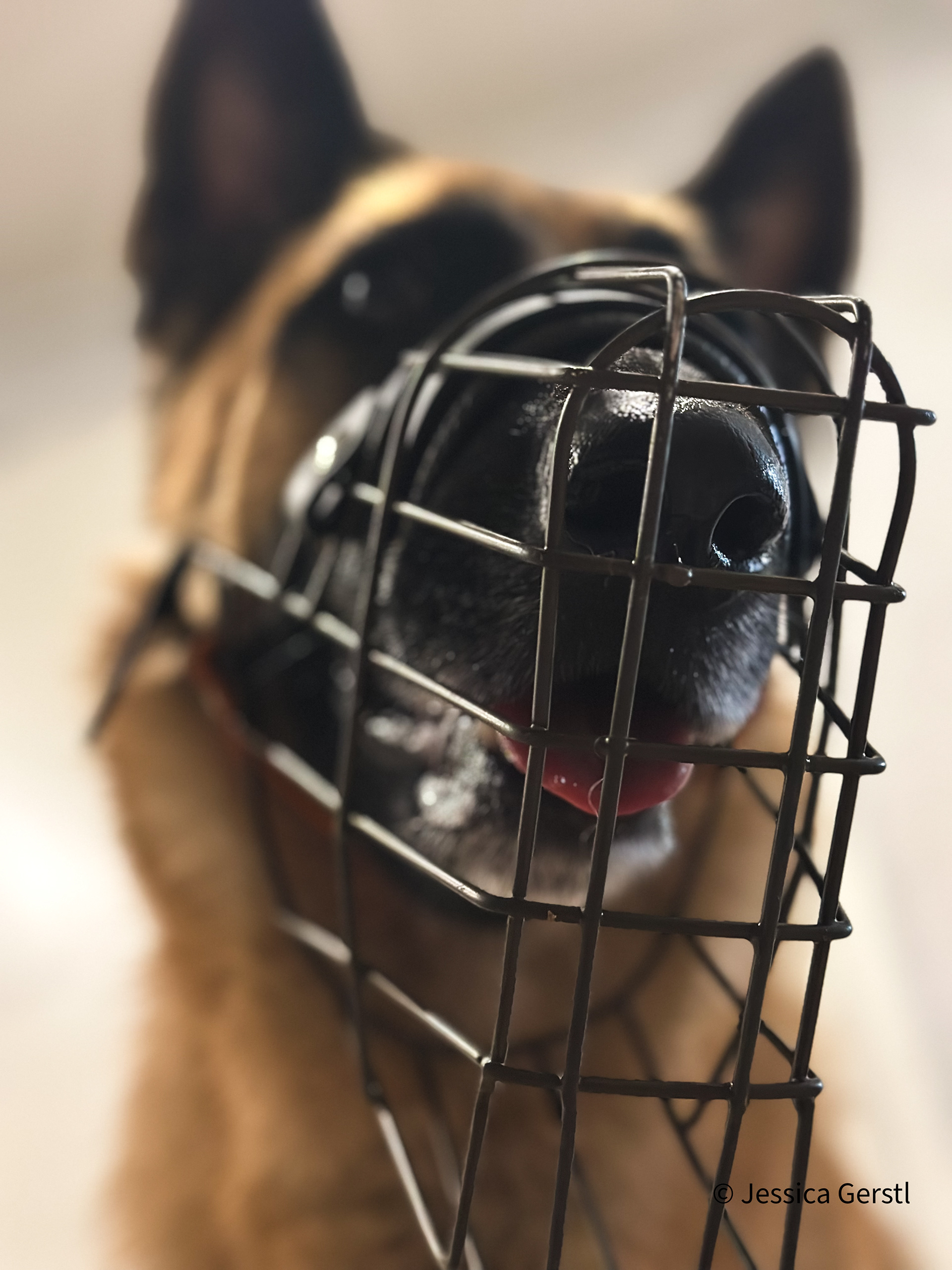 Grund: Maulkorbtraining für den kommenden Urlaub und als leichter Fressschutz um sofortiges Aufnehmen von Nahrungsabfällen und dergleichen zu verhindern.